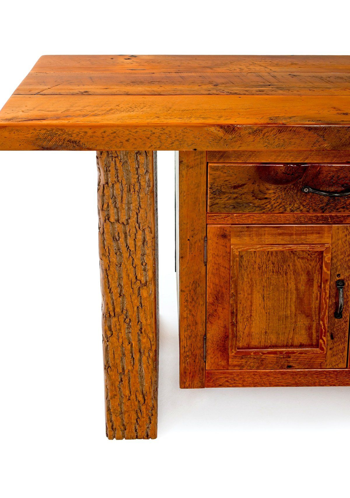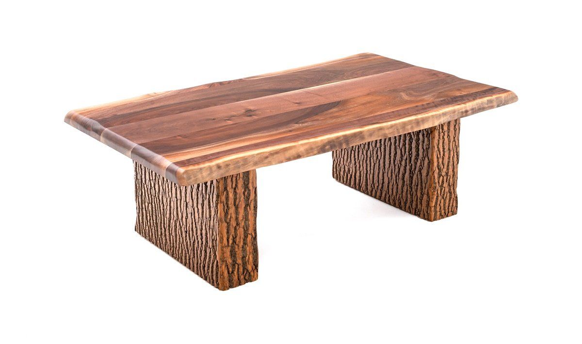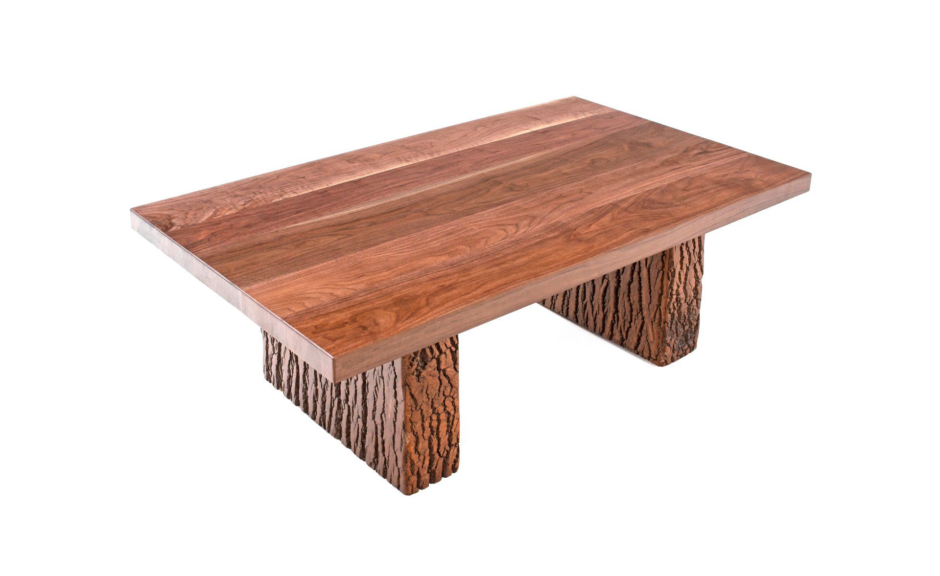The substance of the Birchmere Collection is its unusual square log bases made with a vertical poplar bark veneer. Tops are salvaged wood, live edge or walnut with blackened steel hardware.