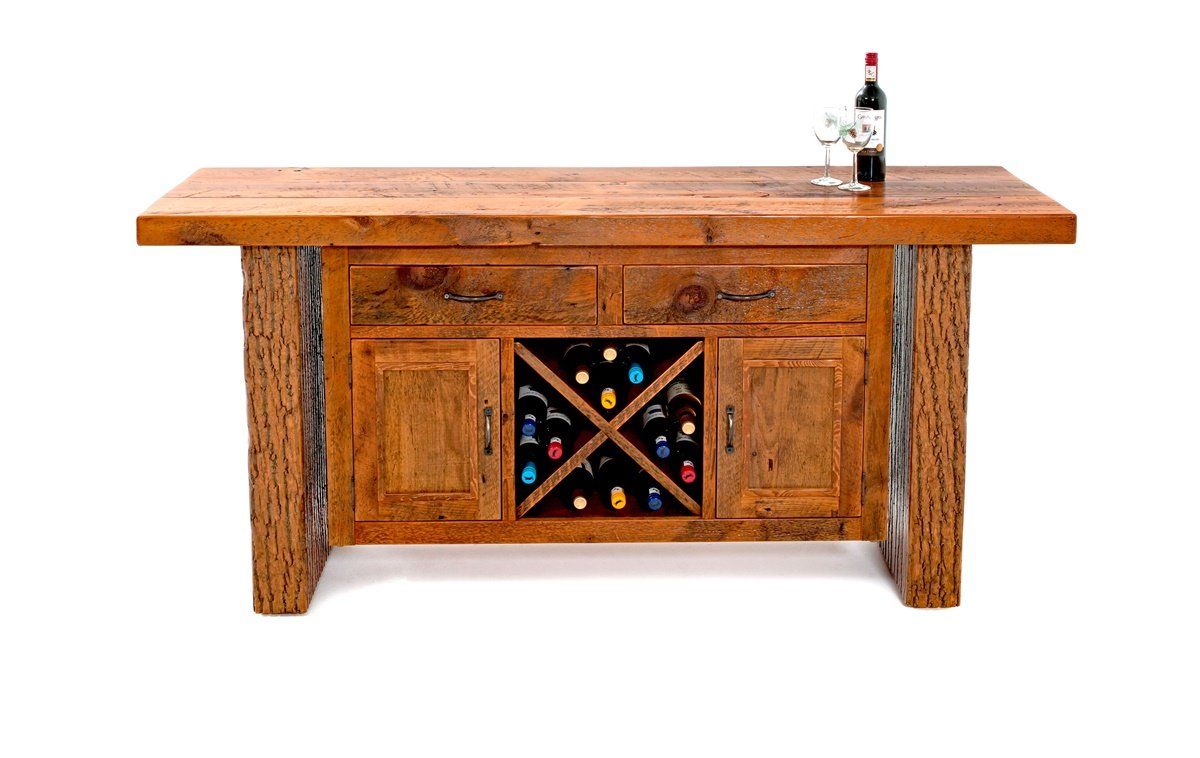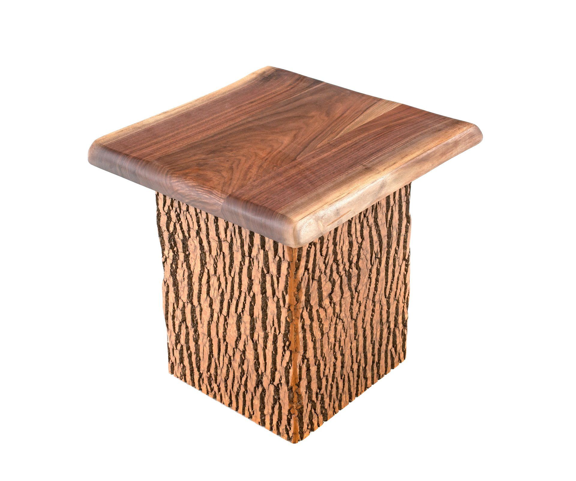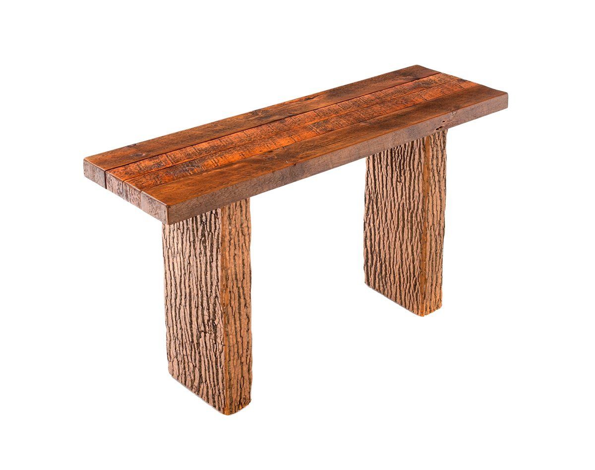 The substance of the Birchmere Collection is its unusual square log bases made with a vertical poplar bark veneer. Tops are salvaged wood, live edge or walnut with blackened steel hardware.