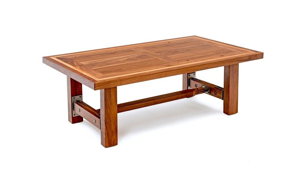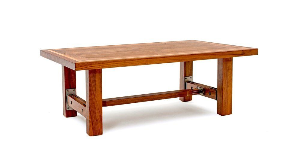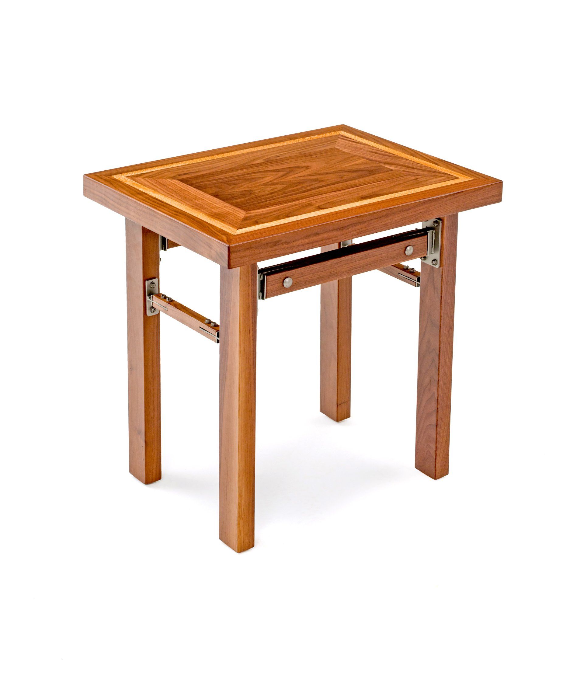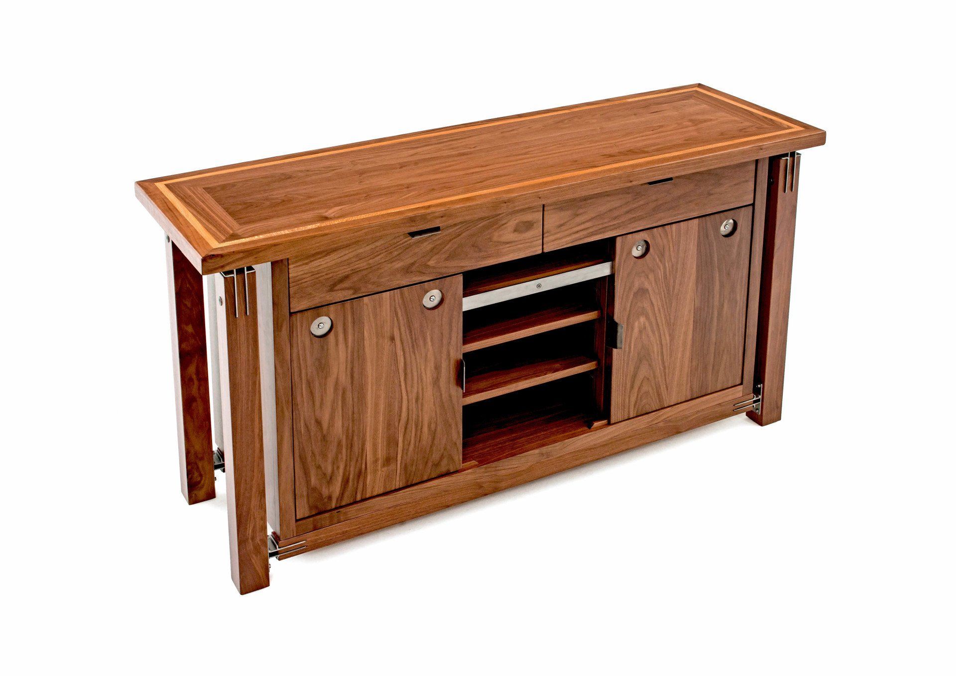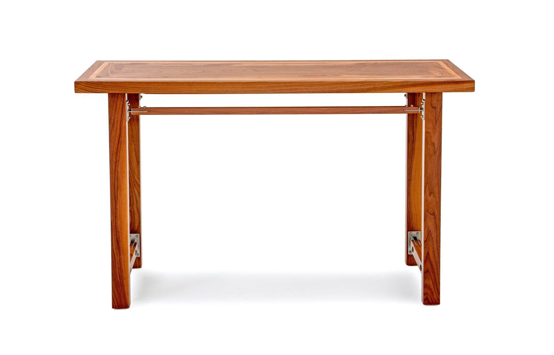 This sleek and stylish collection is breathtaking. Innovative stainless steel brackets join gorgeous walnut or cherry legs, and tops are detailed with a lively sycamore accent.